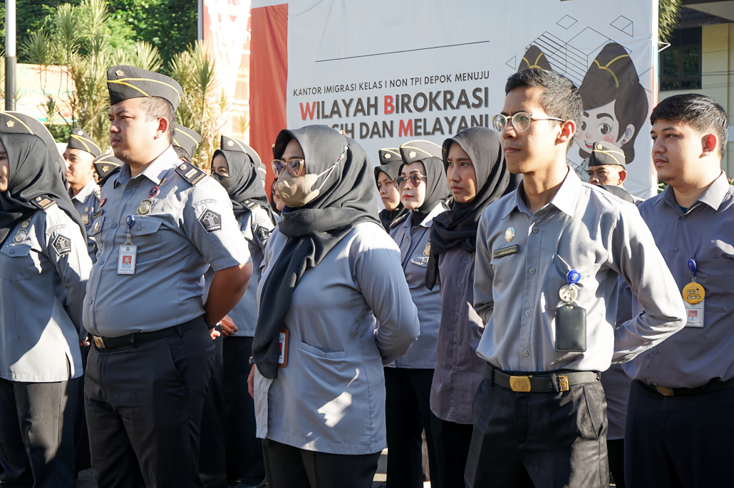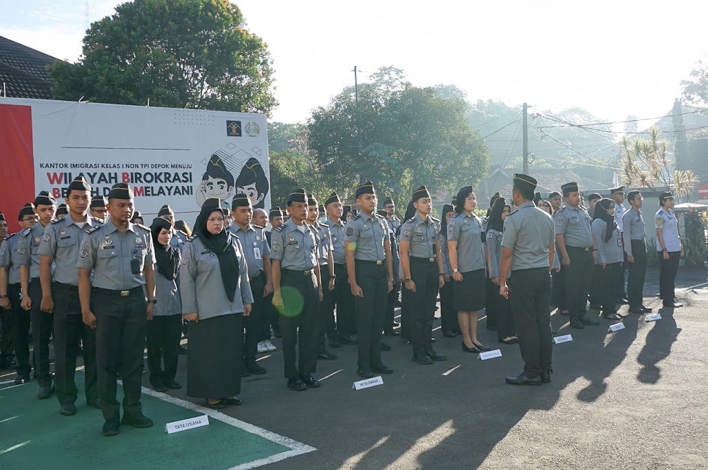 DEPOK – Kantor Imigrasi Kelas I Non TPI Depok melaksanakan kegiatan apel pagi di bertempat di halaman parkir Kantor Imigrasi Kelas I Non TPI Depok, Senin (08/07/2024). Apel pagi dipimpin oleh Irvan Triansyah selaku Kepala Kantor Imigrasi Kelas I Non TPI Depok dan diikuti oleh seluruh Pejabat Struktural, Pegawai, dan PPNPN Kantor Imigrasi Kelas I Non TPI Depok.