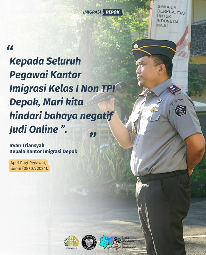 Dalam arahannya, Kakanim Irvan menyampaikan 3 arahan penting. Pertama disampaikan bahwa kepada seluruh pegawai diminta untuk dapat hadir dan mengikuti kegiatan Apel Pagi. Apel dilaksanakan sebagai bentuk pelaksanaan tanggung jawab pegawai karena dengan melaksanakan apel berarti telah mencerminkan kedisiplinan pegawai. Selanjutnya Kakanim menyampaikan kepada pegawai Kantor Imigrasi Depok untuk menghindari bahaya negatif judi Online dikarenakan judi online hanya dapat menghancurkan diri keluarga dan karir. Kakanim juga melakukan pemeriksaan pada beberapa pegawai yang membawa handphone, memastikan tidak ada aplikasi judi online di dalam perangkatnya. Terakhir Kakanim menghimbau untuk dapat menjaga kebersihan dan kenyamanan kantor.