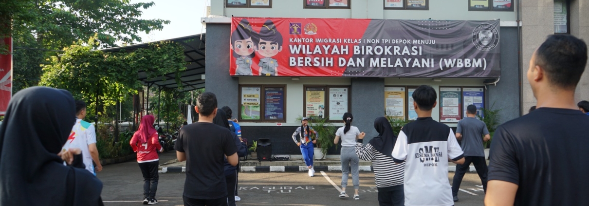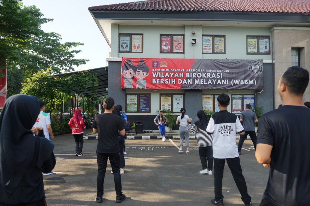 Jumat (23/02), Pegawai Kantor Imigrasi Kelas I Non TPI Depok yang biasanya selalu disibukkan dengan rutinitas kegiatan pelayanan keimigrasian dan dikejar target pekerjaan, tak melupakan kesehatan dan kebugaran tubuh. Secara rutin setiap hari Jumat, Kali ini Kantor Imigrasi Kelas I Non TPI Depok mengadakan senam pagi bersama di halaman parkir kantor imigrasi depok. Kegiatan dilakukan mulai pukul 07.00 WIB s.d selesai dipandu oleh seorang instruktur senam. Genre senam yang biasanya dihadirkan adalah aerobik, zumba, poco-poco dan lainnya.